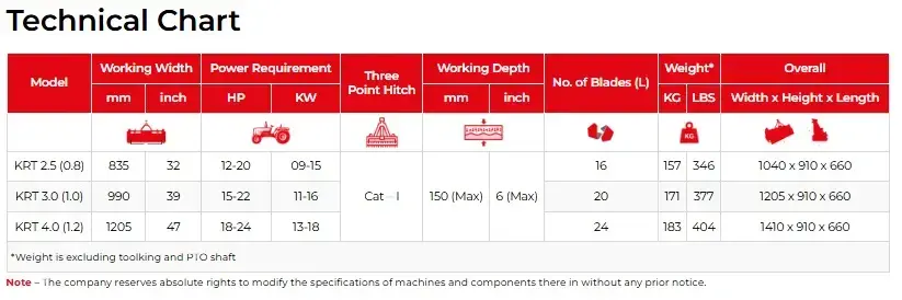 ऊपर दिखाए गए तकनीकी विनिर्देश मल्टी स्पीड गियर बॉक्स और साइड गियर ड्राइव क्रांति रोटरी टिलर के हैं।