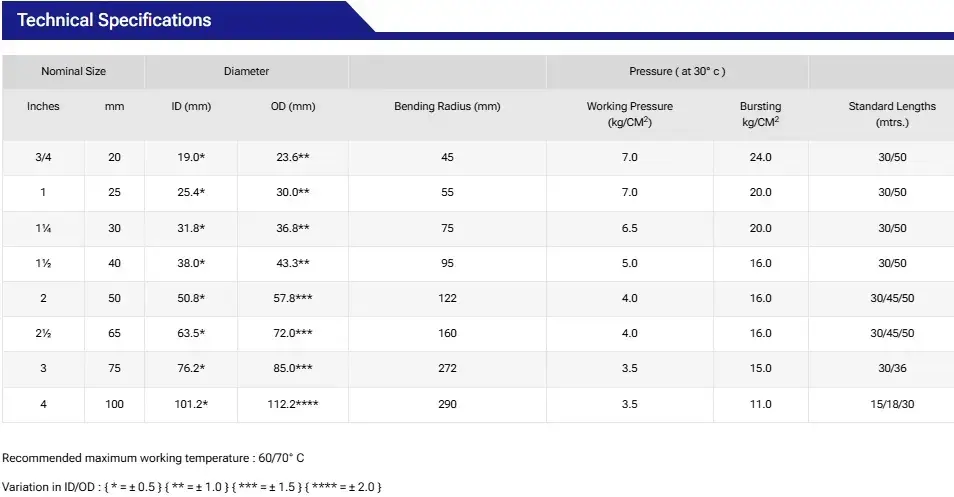 Resistance : It shows strong resistance in high pressure and most of the chemicals, light acids, alkalies excepting solvents. Ideal for high pressure suction & delivery of water.